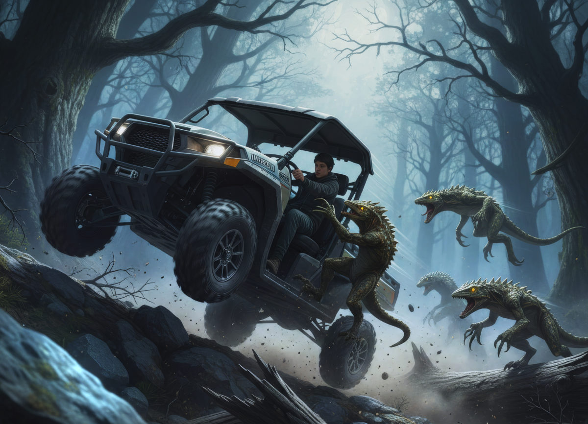 I den tågede, mystiske skov kæmper en modig eventyrer for at undslippe en flok glubske øgler i sit terrængående køretøj. Med hjulene løftet fra jorden og motoren brølende, navigerer han gennem det ujævne terræn, mens de forhistoriske væsner med lysende øjne jager ham tæt. Spændingen er intens, og hvert et øjeblik er en kamp for overlevelse i denne farefulde vildmark.